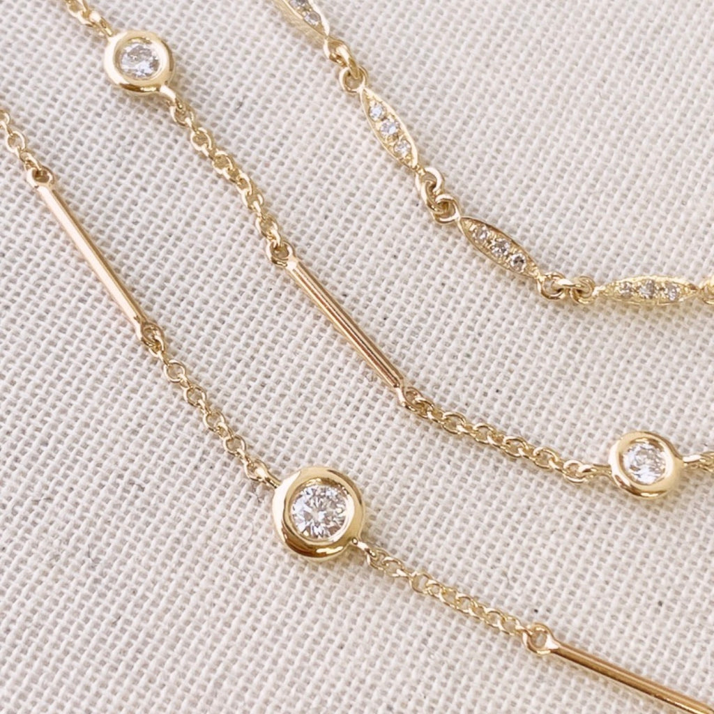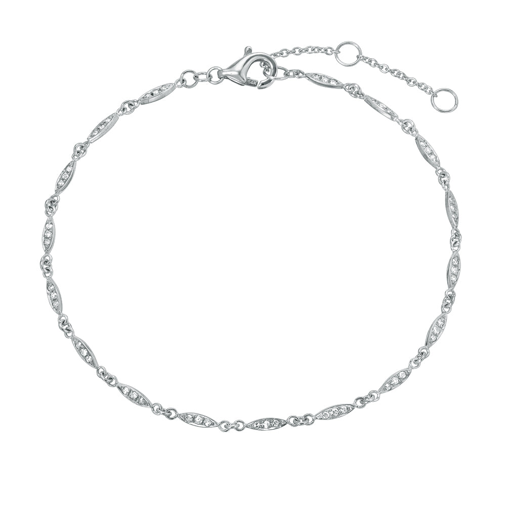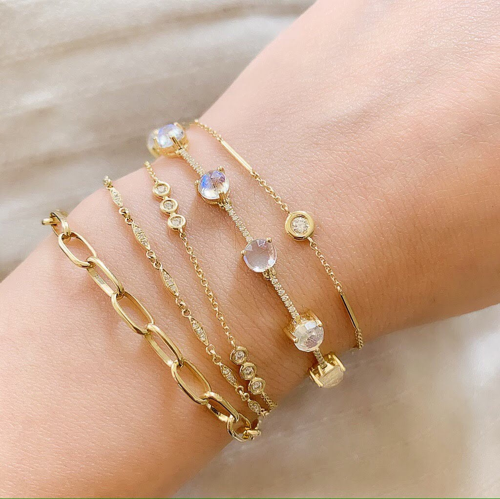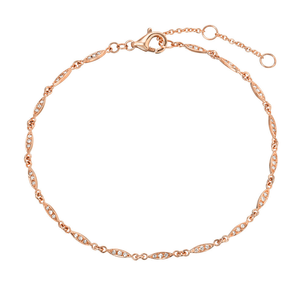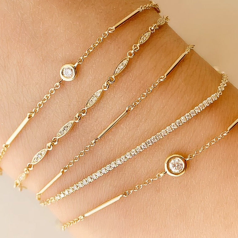14k gold bracelet with diamonds set on its daisy-chain style willow leaves. The willow represents balance, growth and harmony. Each leaf on this dainty bracelet can be assigned a meaning, to create a powerful talisman for you and your loved ones. Some colors may require a special order.