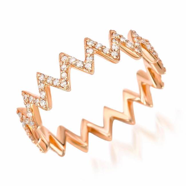 This 14k gold halfway diamond studded ring features a zigzag pattern that fits like a puzzle piece when multiple zigzag rings are stacked together.