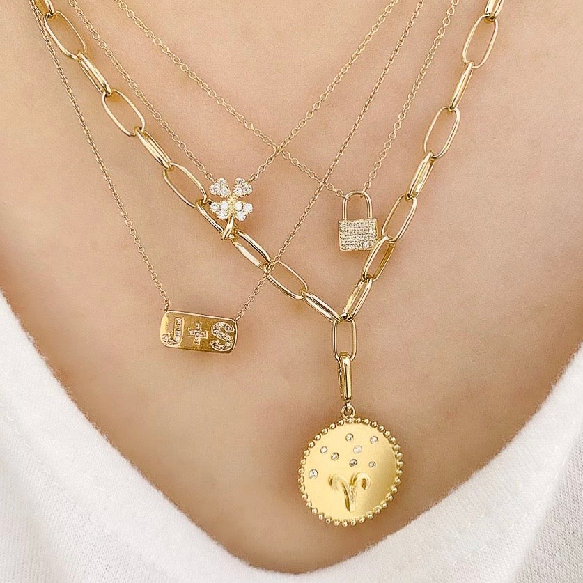 These beautiful talisman discs feature the symbol for your chosen sign, along with eight scattered diamonds, for luck, all set in stunning 14k gold. Add to your favorite chain, or choose one of our Unity Chains or Hand Made Chains.